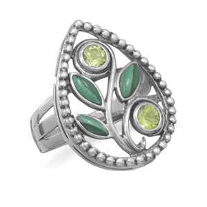 This brand new ring has a genuine .925 sterling silver band with a pear shape design that features a beaded edge. This ring features round 4 millimeter genuine Peridot stones and 3 millimeter by 6 millimeter marquise shape genuine Malachite stones! Available in whole sizes 6-10, this magnificent ring is a great addition to any jewelry collection!