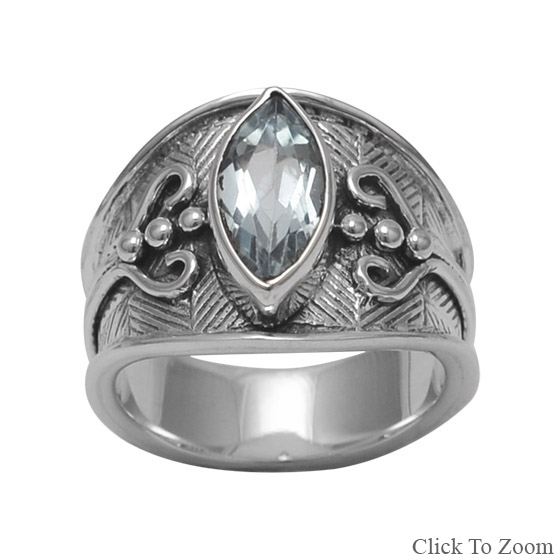 This gorgeous brand new ring is a genuine stamped .925 sterling silver ring with an oxidized textured finish and it features a marquise shape genuine blue topaz stone measuring approximately 6 millimeters by 12 millimeters! The ring has a beaded swirl design and measures 16 millimeters wide across the top, tapering to 6 millimeters in the back. This beautiful ring is available in whole sizes 5, 6, 7, 8 and 9 (US) All buyers are contacted via email upon purchase confirmation to verify their desired ring size prior to shipping. International buyers are welcome to contact us for a link to a ring size conversion chart to determine their correct corresponding ring size prior to purchase.