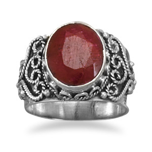 This brand new ladies ring is a genuine .925 sterling silver ring with a beautiful oxidized ornate design band and it features a genuine oval shaped rough-cut faceted Ruby measuring 11.5 millimeters by 9 millimeters! This genuine ruby ring is available in whole sizes 6-9. All buyers are contacted via email upon purchase confirmation to verify their desired ring size prior to shipping. International buyers are welcome to contact us for a link to a ring size conversion chart to determine their correct corresponding ring size prior to purchase.