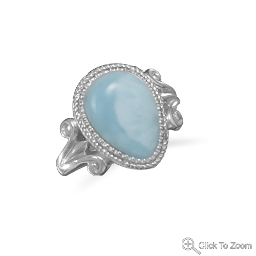 This stunning brand new ring features a pear shape genuine Larimar stone measuring 11.2 millimeters by 21.5 millimeters! The band is genuine .925 sterling silver with a swirl design on either side of the stone which also features a bead edge design!