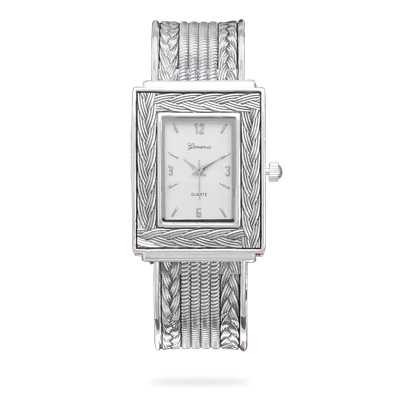 This brand new watch features a hinged cuff design with an oxidized bali look. This is a very pretty Bali style watch with a 32 millimeter by 24 millimeter dial face and a 17 millimeter wide band.