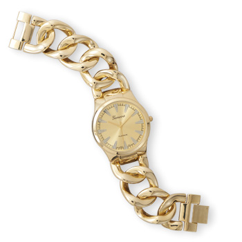 This brand new watch is a 7.5" gold tone curb link Geneva brand fashion watch. The band is 25mm wide. The watch case is 37mm. The watch has a fold over clasp closure.