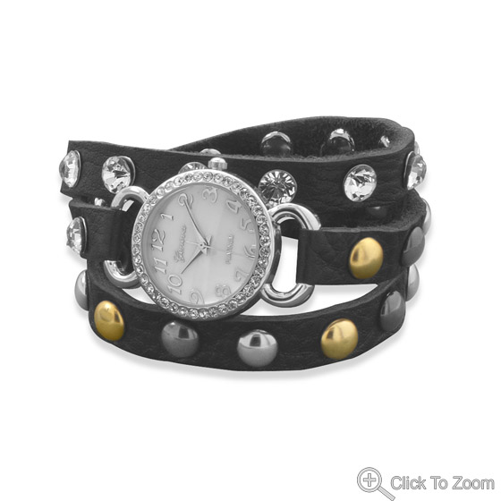 This brand new Geneva brand watch is a wrap style 20.5" - 23" band watch with a black colored fine leather band and a 27mm round face. The 10 millimeter wide band has 7.5mm crystal and metal beads.