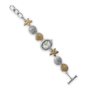 This brand new watch is a 7 inch with 1 inch extension fashion watch with a stylish toggle clasp style closure. The gold tone and silver tone finish enhances the mother of pearl dial face measuring 22 millimeters by 26 millimeters and the starfish, sand dollar and clam shell design links complete the nautical theme!