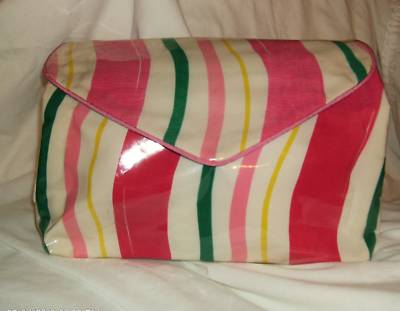 This bag is made of PVC, Bold Bright Stripes of Pink, Green, Yellow with white background