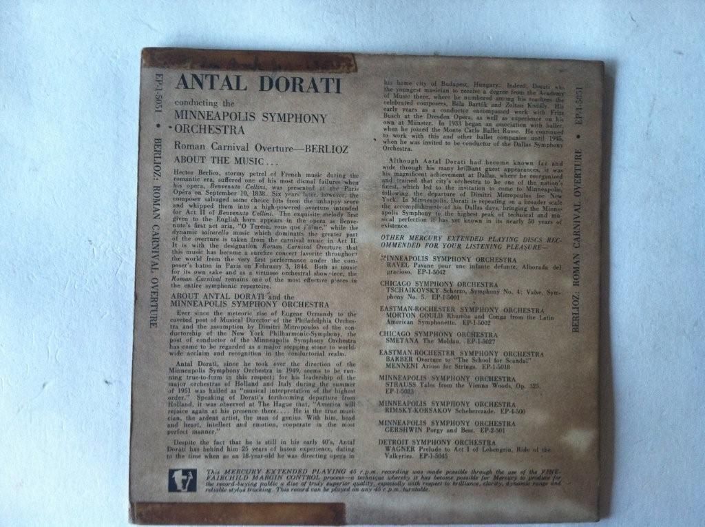 Antal Dorati, berlioz Roman Carnival EP-1-5051 Mercury Living Presence in VG++