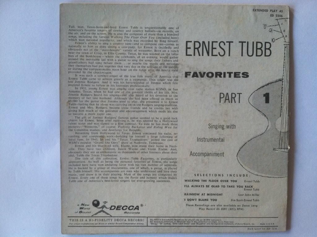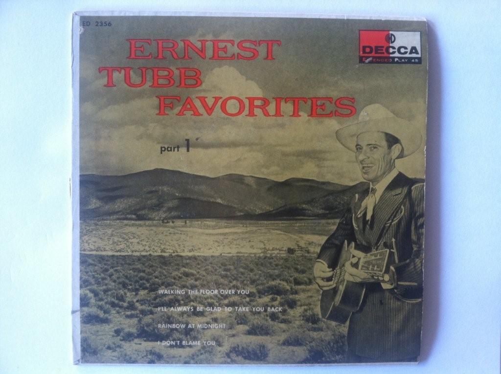 Ernest Tubb, Favorites Part One, Walking The Floor Over You, I'll Always Be Glad To Take You Back, Rainbow At Midnight and I Don't Blame You on Decca EP ED2356 in VG condition.