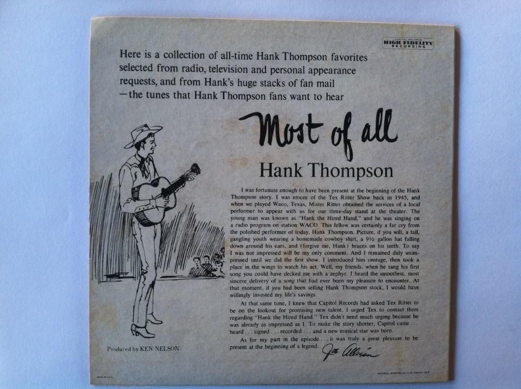 Hank Thompson, Most Of All EP 1360 Most Of All, Squaws Along the Yukon in VG+ Price:  $10.00