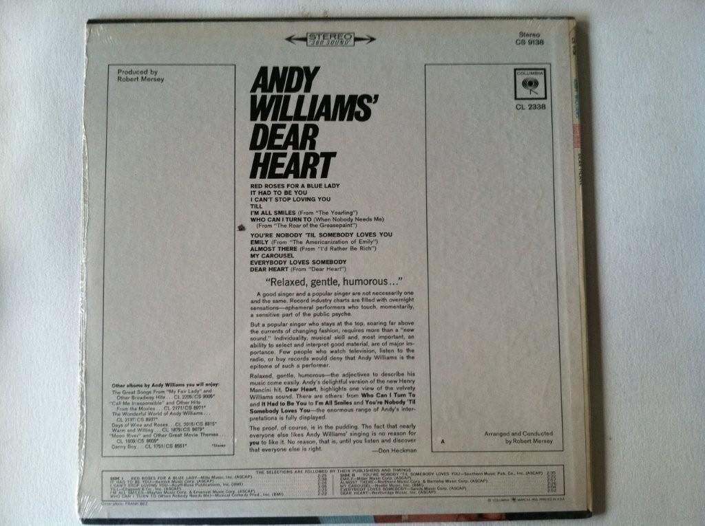 Andy Williams, Dear Heart, Sealed and in Mint Condition Columbia CS 9138 Price:  $10.00