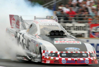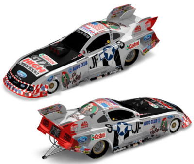 2010 John Force / Castrol GTX / American Warbird / Ford Mustang NHRA Full Throttle Funny Car diecast, by Action. The The John Force Racing American Warbird Ford was raced by John Force in the 33rd Annual NAPA "Night Under Fire" event at Summit Motorsports Park in Norwalk, OH.