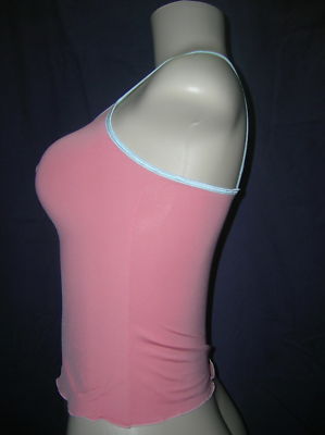Here is a sexy solid pink with light blue trim, sleep cami/camisole/tank/lingerie with blue trim. It features a nice satin like feel against the skin.. These are brand new shelf pull items (no longer in stores). The only defect is a missing inner label due to trademarking laws. Tag says size Small, but there is significant stretch. (Mannequin is a size medium for reference). Good Luck.