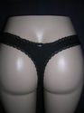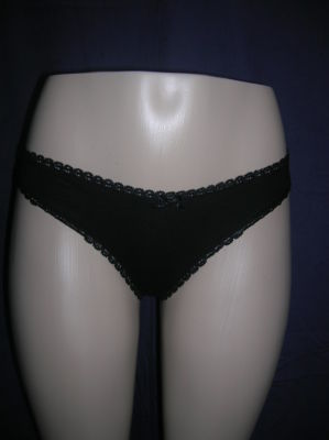 Here is a sexy pair of black lacey thong underwear by the brand "La Senza". They have a very silky feel against the skin.The lace has a little bit of stretch to it as well. Brand new items that have been pulled from shelves. The only defect is a missing inner label due to trademarking laws. Size Large (US). Good Luck