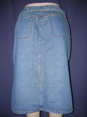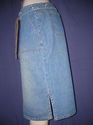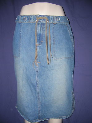 Here is a nice belted denim/jean skirt by "French Cuff" in excellent used condition. It is knee length. size 12. Good Luck.