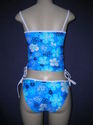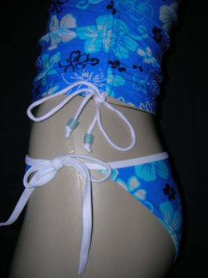 Here is a cute new blue Hawaiian floral print tankini style swimsuit/bikini/swimwear/bathing suit by the brand "Point Zero". The top features beaded drawstrings on both sides for decoration, and an inner bust support liner. The bottoms tie strings on both hips. Very nice. Brand new items that are shelf pulls (no longer in stores). They were in individual bags, removed for photos, then replaced in their bag. Only defect is a missing inner label due to trademarking laws. Size 8. Good Luck.