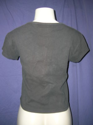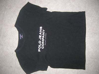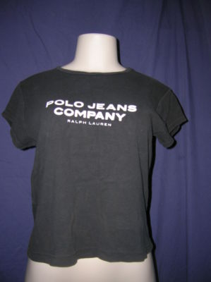 Baby doll T-shirt has capped sleeves and is silkscreened with the company name across the front. Polo Jeans Company by Ralph Lauren. Good Luck.