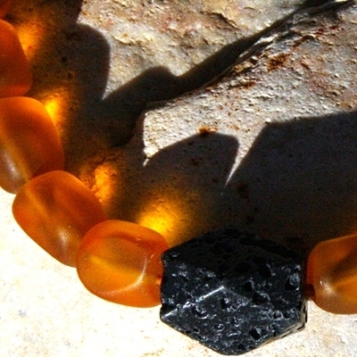 This outstanding necklace is created from amber frosted tumbled glass chunks and black Lava Stone faceted with diamond shapes. Wonderful rich tones of amber frosted glass compliment Lava Stone beautifully. The focal Lava Stone takes high polish and contrasts with frosted finish of the amber glass.