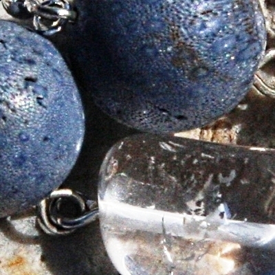 These fine earrings have a soothing coolness of the blue coral and the genuine rock quartz crystal.