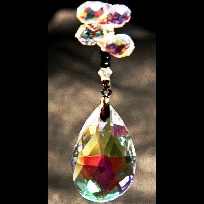 The rainbow crystal cut in a shape of a teardrop is suspended on a sterling silver bail.