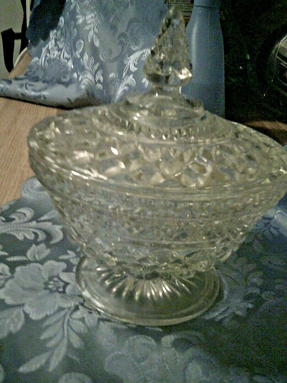 Decorative Cut pattern glass lidded candy dish approximately 8" tall total great vintage piece.