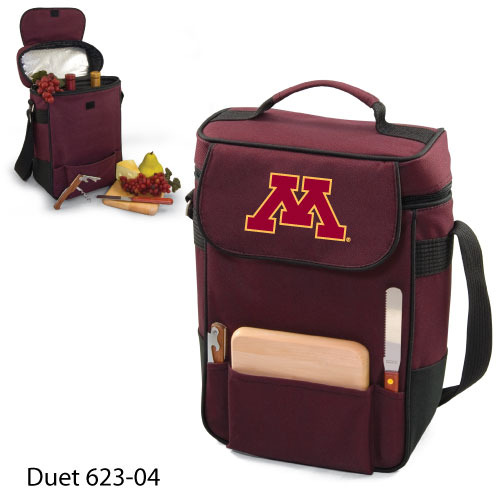 Insulated wine and cheese tote with 2 compartments for wine made of 600D polyester canvas. The elegant and unique Duet wine and cheese tote is perfect for picnics concerts or travel. This tote has two compartments for wine bottles and a storage section to carry the amenities included: hardwood cutting board water style corkscrew and cheese knife. The adjustable shoulder strap makes it easy to carry. Convenient and practical the Duet is perfect for wine and cheese lovers. A wonderful gift idea! Includes: 1 Corkscrew (waiter style stainless steel) 1 Cutting board (wood 6 x 6 in.) 1 Cheese knife (stainless steel w/wood handle). Color: Burgundy. Decoration: Digital Print."" Case Pack 8 Please note: If there is a color/size/type option the option closest to the image will be shipped (Or you may receive a random color/size/type).