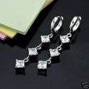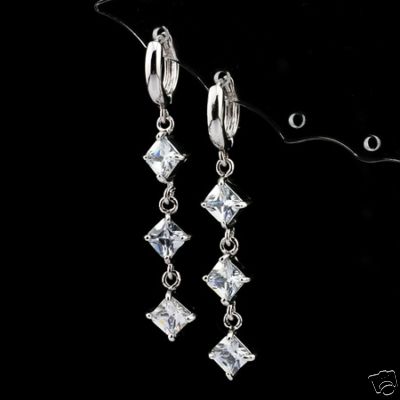 Item Description Material : 18K White Gold Plated Total Weight : 5.8 grams Quantity : 1 pair Stone Type : Cubic Zirconia Stone Color : As shown in picture Stone Cutting : Princess Cut Dimension : Earring: 7 x 45mm Main Stone: 5mm x 5mm Finish : Excellent Polished