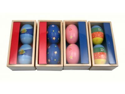 Egg Maracas A pair of boxed egg shakers or maracas Beautifully presented in a wooden gift box these instruments are easy for small hands to hold and play. Great for little dancers to play while moving. The designs are painted in four different patterns: blue fish, blue stars, pink stars and hearts and a multi-coloured flower pattern.