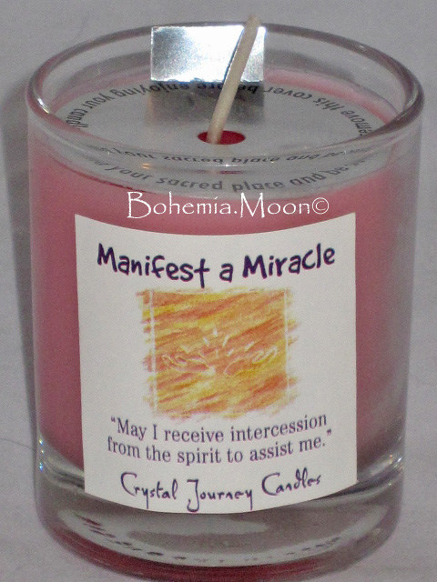 This collection includes a high quality Crystal Journey VOTIVE candle in a glass votive holder.   The MANIFEST a MIRACLE candle has been carefully developed using the purest of ingredients for the charge.  Fragrances for this candle include a mix of Rose, Honeysuckle and Magnolia.