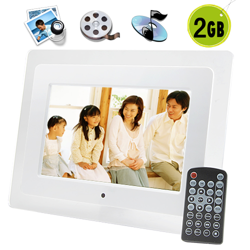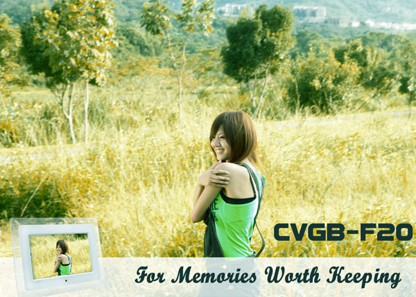 Simply load your files into the 2GB memory of the CVGB-F20 Digital Photo Frame with Music and