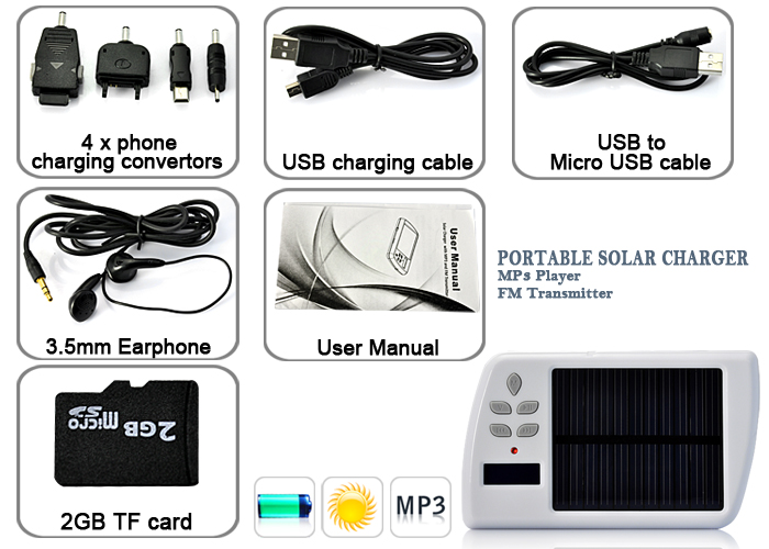 3 Hours sun charging for: over 1 hour phone talking time, 8 hours music playing, 8 hours FM emission, 10 hours standby time