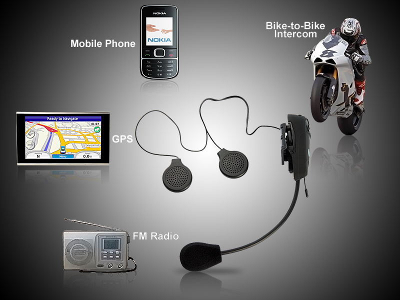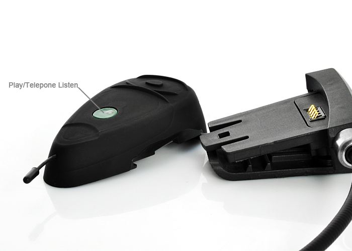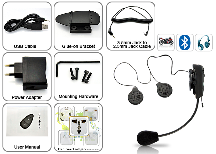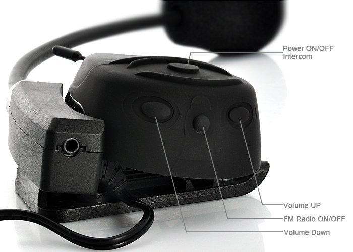 Buttons/Ports/Features: - Charging Port - 2 Velcro-on speakers - Adjustable microphone - 2.5mm audio jack IN - Power ON/OFF/Intercom call button - Radio ON/OFF/Answer/End/Last Number Redial button