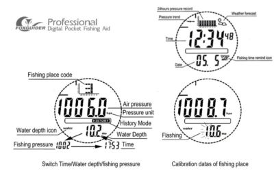 Data records - Up 6 fishing places: pressure, time, water depth - 3 days history: weather, pressure trend, maximum and minimum pressure, temperature