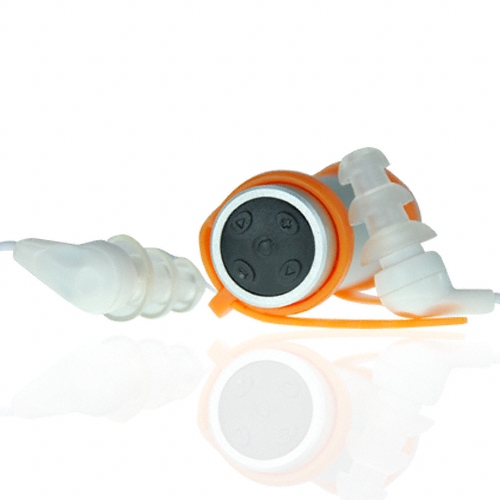 Waterproof MP3 player and earphones for use while swimming, playing water sports, or taking a shower