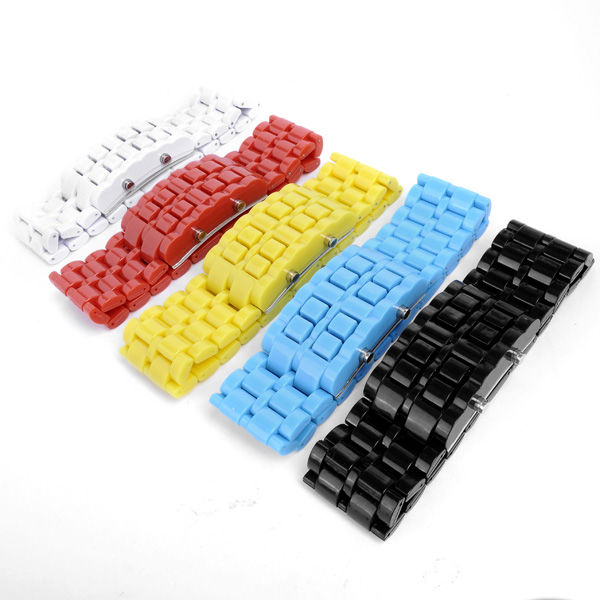 Fashion design with unique exquisite appearance Brand new & High quality watch Display hour, minute 12H/24H conversion functions Precise and durable wrist watches The watches are the perfect gift for you and your lover Top and bottom row LED lights for hour and minute display This bangle wrist watch is a crazy but kind of cool looking watch has animated effects when wanting to see the time Tap the bottom button to make the numbers blink and hence adjust them Wrist watch strap feels comfortable and secure on the wrist Stylish and exquisite design, this bangle wrist watch is suitable for many occasions like party, ball, date Glamorous digital bangle wrist watch is a versatile accessory for you This digital wrist watch is an accessory that is stylish, and just happens to tell you the time in a creative way Color: Blue, White, Black, Yellow, Red (as pictures show) Size: Dial: 4.5x 2.7cm; Band: 17cm; General length: 22.5cm Weigt: 91g