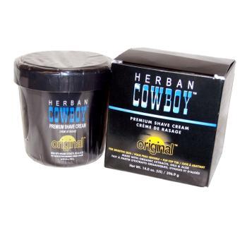 " Eco Friendly Product Herban Cowboy Premium Shave Cream Original. Formulated for Enhanced Skin Protection. For Sensitive Skin. Flip-Top Tub. Made with Organic Extracts, Oils & Aloe. Alcohol-Free. Dye-Free . Certified Organic. Sweatshop Free. Recycled. Recyclable Packaging. Vegan. Cruelty Free. 14oz. Made in USA " Case Pack 18
