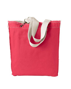 100% cotton canvas; Natural canvas webbing straps; antique brass hardware; inside hanging pocket; 13 1/2"W x 14"H x 3 1/2"D;