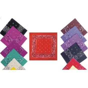 "Printed cotton bandannas in assorted colors. 22""x 22"" Size. Bandanas colors may differ from case to case. Assorted colors as shown. May or may not include all of the colors shown in photo. These cheap bandanas come with a small hook and tag for hanging." Case Pack 72
