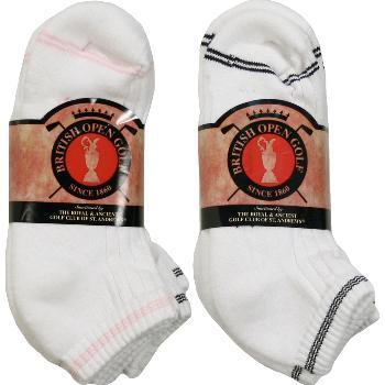 "Women's British Open white with stripes cotton ankle sock mix pack. Women's sizes 9-11. Socks packaged 3 pairs to a pack, 12 packs per case. Mix includes an assortment of white socks, with black and pink stripes. Perfect for your golf outings." Case Pack 12
