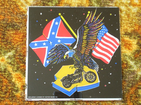 This is a 8 x 8 glass display,of Motorcycle & Eagle, w/ Flags