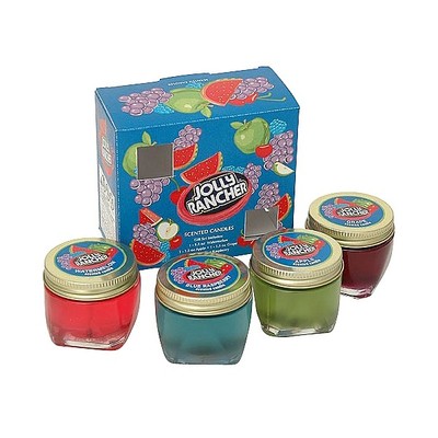 Jolly Rancher Candle Set Set of 4 Candles share the same intense aromas as your favorite fruit-flavored hard candies. Simply light them and relax as their aroma diffuses through the room. The set of 4 candles includes Grape, Apple, Blue Raspberry and Watermelon. Each 1.5 oz mini jar candle has an 11-hour burn time for a total of 44 hours of fragrant enjoyment. Irresistible! Made in the USA Glass jars and metal lids