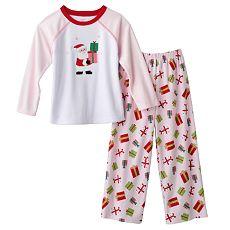Girls pajama set by Carter's. In pink. Top with Santa applique . Tag free neckline. Coordinating pants with presents design. Full-elastic waistband for pull on ease. Details: 2-piece set includes: long sleeved top & pants Cozy fleece construction Polyester Machine wash Garments are flame resistant