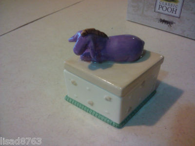 This is a Classic Pooh ceramic trinket box by Charpente a division of Michel & Co. This is mint in a Classic Pooh Charpente box, but not its original box. It came from an estate sale, I do not know if it was ever displayed out of its box. The box does have "eeyore box" written in pen on it on the top. Adorable little diamond Shaped box standing about 3" tall from the top of Eeyore's head to the bottom of the box. Lid lifts off to hid trinkets inside! You will love it! Check out my other items!