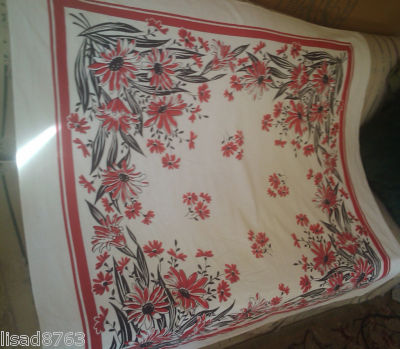 Vintage Tablecloth Red and Black Floral 47"x 53"