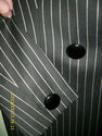 Genny black and white pinstriped double-breasted jacket with lapels in solid black. Easily paired with black pants and a great wardrobe staple.