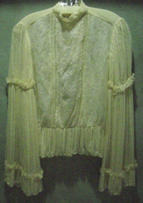 Details include a high neckline; lace front; pleated peplum, bell sleeves and ruffled back; 10 small covered buttons at top in back with open center and hook closure at bottom; pleated ruffles gently fall around the open space.