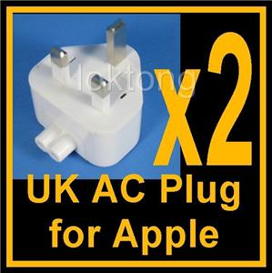 The UK-3 pin adapter replaces the plug end on any white power blocks made by apple such as the chargers for iBooks, PowerBooks, MacBooks, MacBookPros, Express Base Stations Firewire Chargers and USB Chargers.