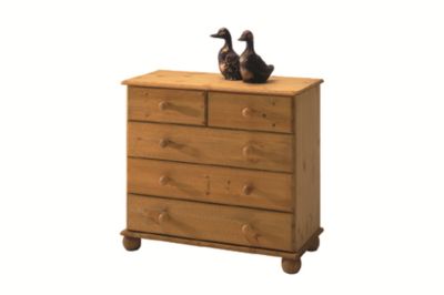 This chest comes with three standard and two smaller drawers, and stands on 4 bun feet.