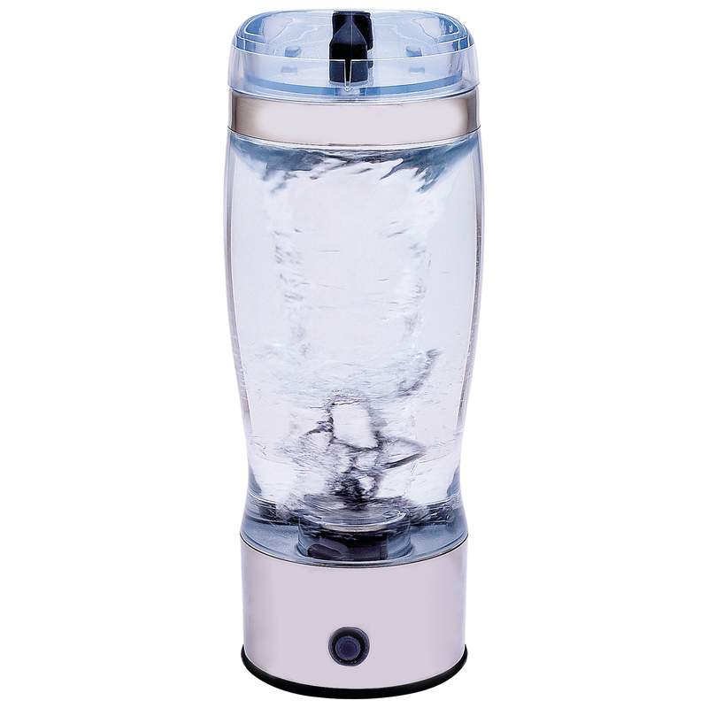 Features clear acrylic mixing container, large motor for mixing, and high-quality, heavy-gauge stainless steel lip and bottom. Requires 2 AA batteries (not included). Patented. Measures 5-5/8" x 7-3/4" x 4-1/8". White box. - Clear Acrylic Mixing Container