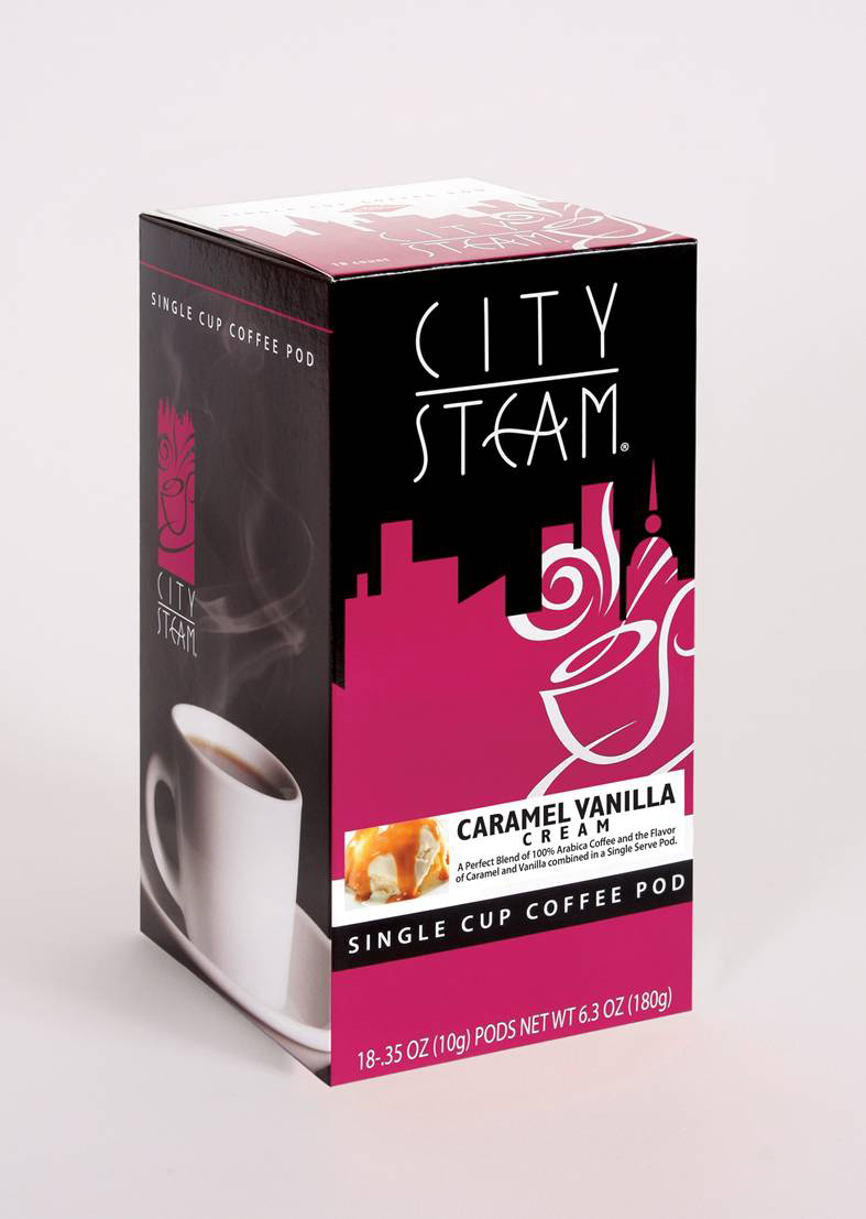City Steam Gourmet Single Serve Coffee Pods are available in a wide selection of blends, roast colors and flavors imported from around the world. From our full-bodied 100% Colombian blend, our French Roast or our decaf, City Steam Single Serve Coffee will brew a perfect single cup of coffee every time. Our coffee pods contain environmentally friendly filter paper and are packed in foil to preserve freshness. The perfect coffee made in less than a minute at home or at the office. 18-count box of 10g single cup coffee pods for use with the BUNN My Caf MC & MCP brewers and other brands and models of pod brewersA perfect blend of 100% Arabica Coffee and the Flavor of Caramel Vanilla Cream combined in a Single Serve Pod.