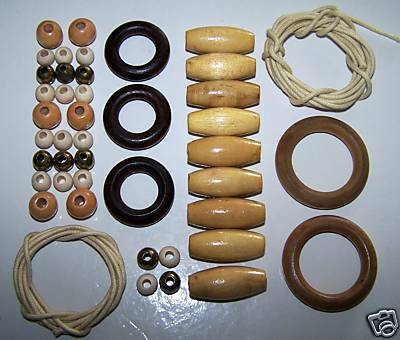 A GREAT MIX OF CHUNKY WOOD BEADS AND RING PENDANTS + CREAM CORD (AS PICTURED)