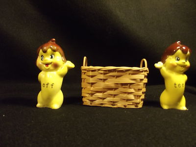 These are not a easy find! The salt shaker with the name "eff" and the pepper shaker with the name "tee" is written across their bellies. They rest in the original basket that Tastee Freeze distributed them in back in the mid century. There is no date imprint but many other markings such as the "s" on the raised hand of eff, and the "p" on the raised hand of tee. These are very rare and in good condition considering their age. Some fading of color here and there, other than that perfect!